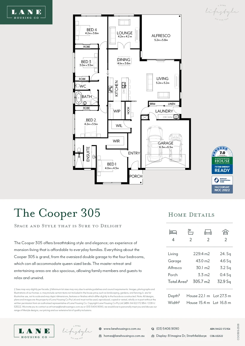 NOTE: Final NatHERS rating and NCC 2022 compliance requires certification of complete site-specific plans by an accredited energy rating specialist. Your home’s energy rating is influenced by the house plans, fit-out choices, and site location. This can include accounting for North orientation, placement of living areas, size and position of windows, site fall, engineering, and other site-specific overlays.