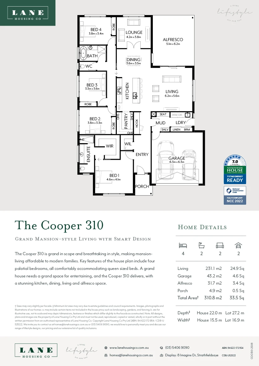 NOTE: Final NatHERS rating and NCC 2022 compliance requires certification of complete site-specific plans by an accredited energy rating specialist. Your home’s energy rating is influenced by the house plans, fit-out choices, and site location. This can include accounting for North orientation, placement of living areas, size and position of windows, site fall, engineering, and other site-specific overlays.