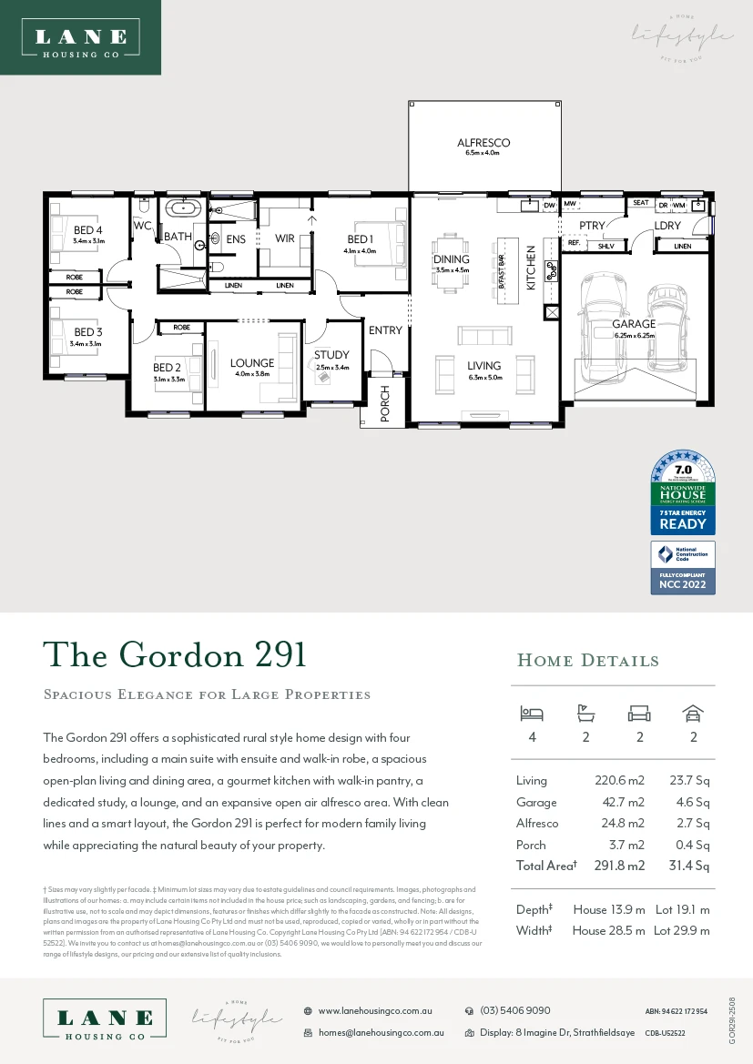 The Gordon 291 offers a sophisticated rural style home design with four bedrooms, including a main suite with ensuite and walk-in robe, a spacious open-plan living and dining area, a gourmet kitchen with walk-in pantry, a dedicated study, a lounge, and an expansive open air alfresco area. With clean lines and a smart layout, the Gordon 291 is perfect for modern family living while appreciating the natural beauty of your property.