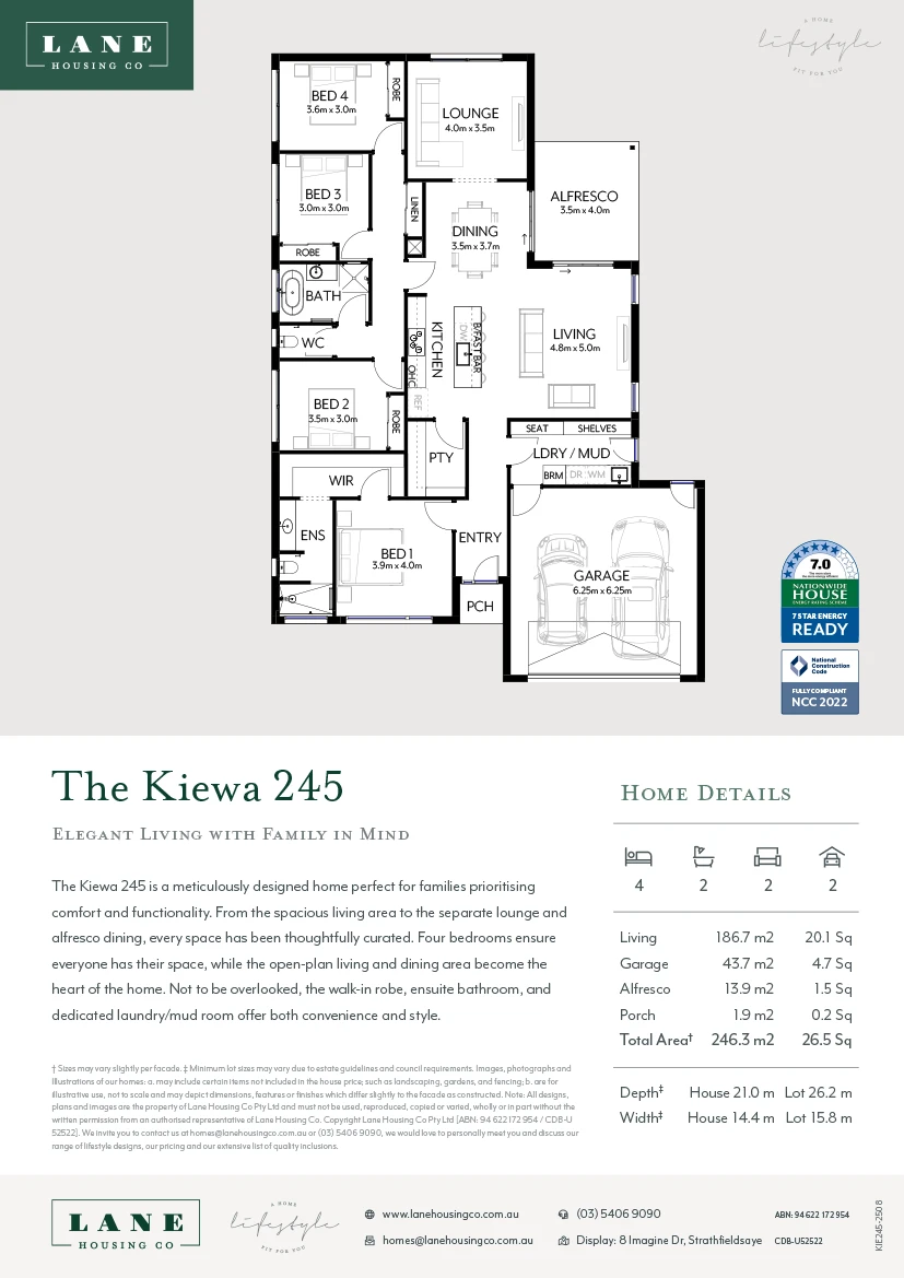 The Kiewa 245 is a meticulously designed home perfect for families prioritising comfort and functionality. From the spacious living area to the separate lounge and alfresco dining, every space has been thoughtfully curated. Four bedrooms ensure everyone has their space, while the open-plan living and dining area become the heart of the home. Not to be overlooked, the walk-in robe, ensuite bathroom, and dedicated laundry/mud room offer both convenience and style.