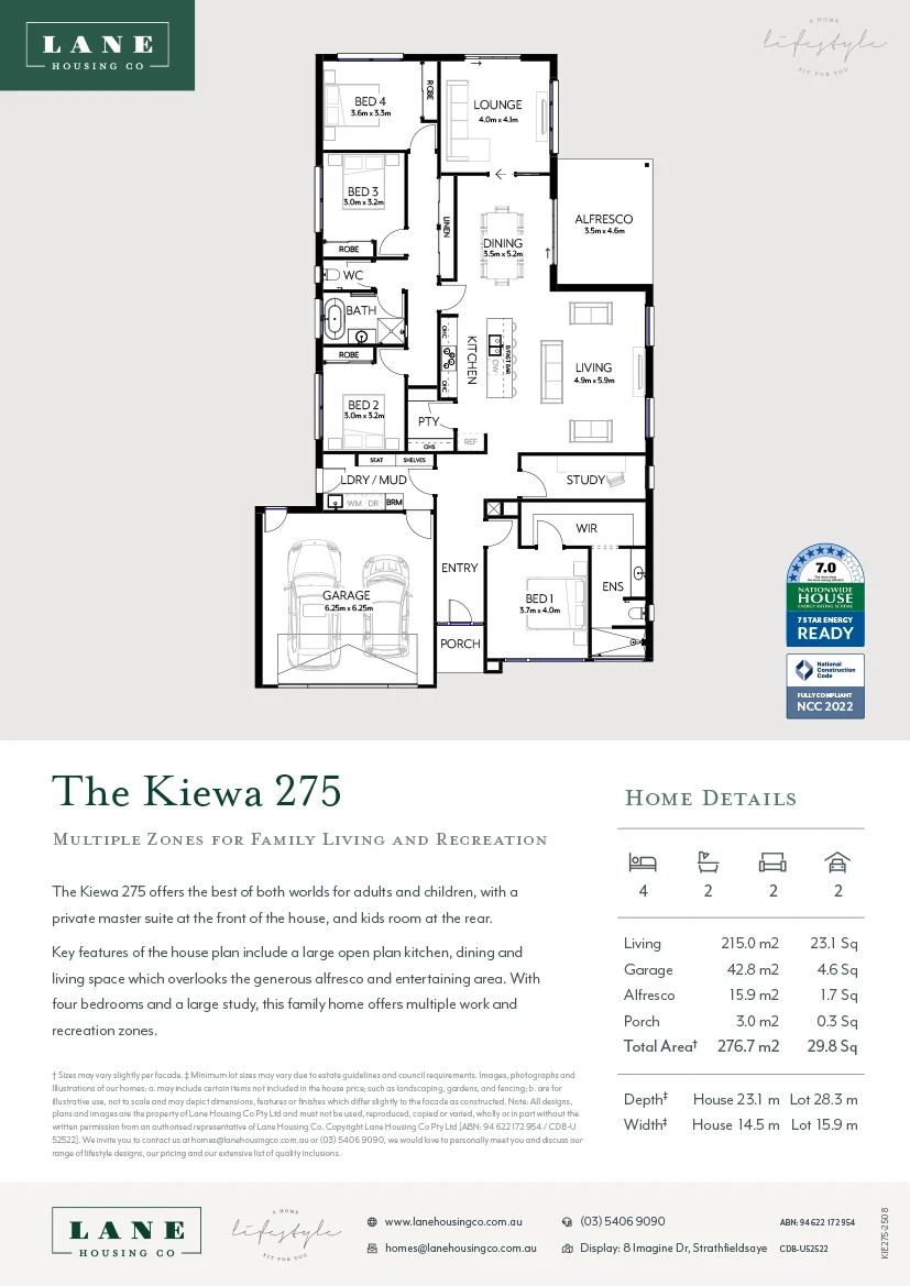 NOTE: Final NatHERS rating and NCC 2022 compliance requires certification of complete site-specific plans by an accredited energy rating specialist. Your home’s energy rating is influenced by the house plans, fit-out choices, and site location. This can include accounting for North orientation, placement of living areas, size and position of windows, site fall, engineering, and other site-specific overlays.
