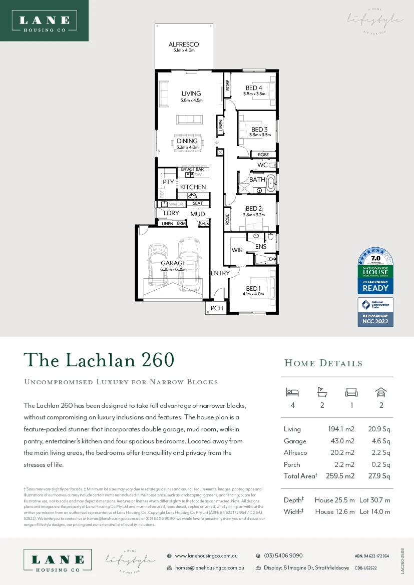 NOTE: Final NatHERS rating and NCC 2022 compliance requires certification of complete site-specific plans by an accredited energy rating specialist. Your home’s energy rating is influenced by the house plans, fit-out choices, and site location. This can include accounting for North orientation, placement of living areas, size and position of windows, site fall, engineering, and other site-specific overlays.