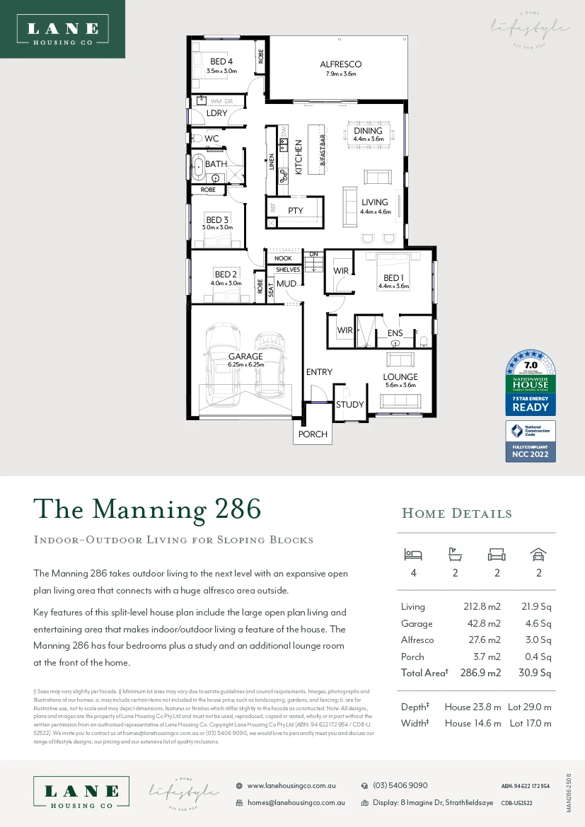 The Manning 286 takes outdoor living to the next level with an expansive open plan living area that connects with a huge alfresco area outside. Key features of this split-level floorplan include the large open plan living and entertaining area that makes indoor/outdoor living a feature of the house. The Manning 286 has four bedrooms plus a study and an additional lounge room at the front of the home.