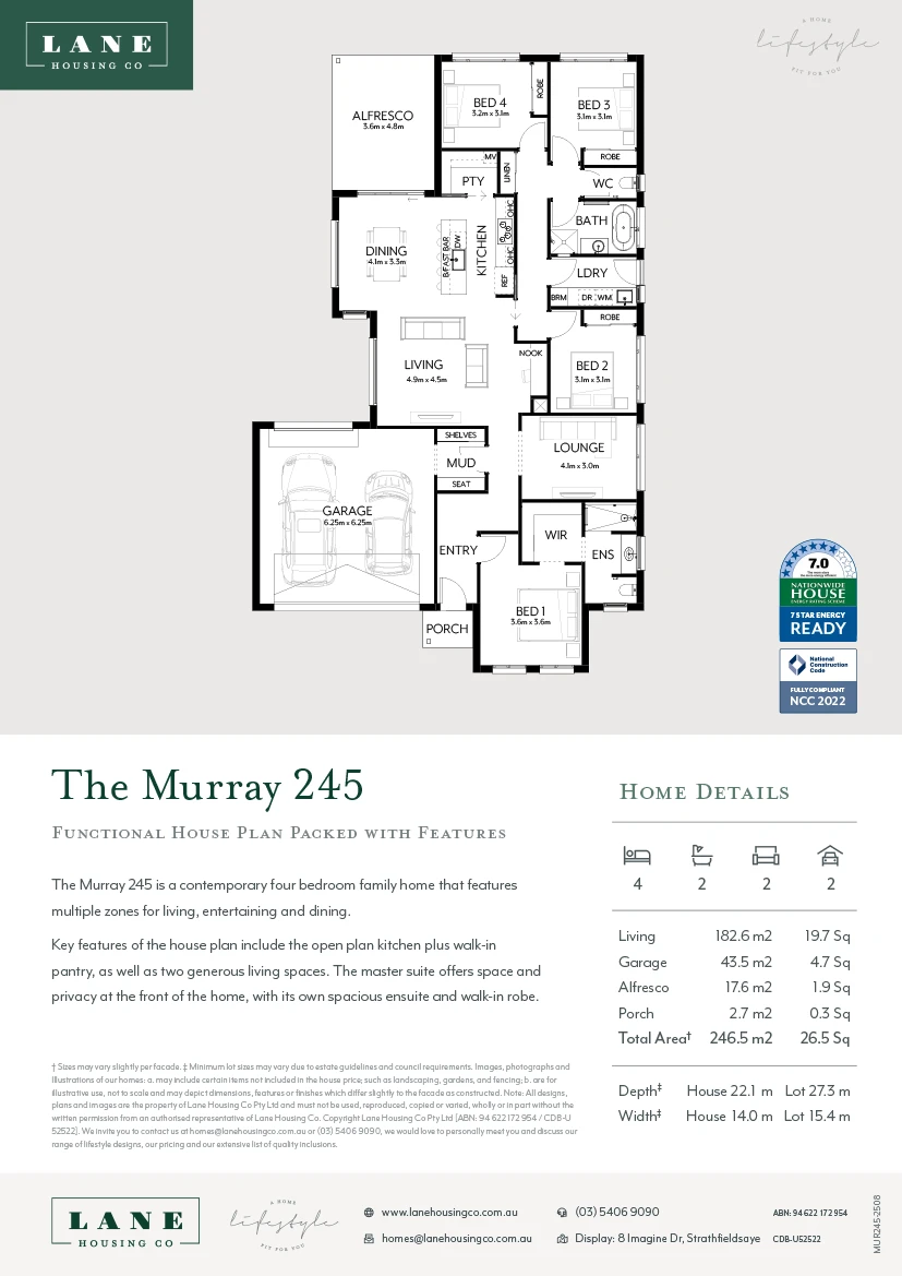 NOTE: Final NatHERS rating and NCC 2022 compliance requires certification of complete site-specific plans by an accredited energy rating specialist. Your home’s energy rating is influenced by the house plans, fit-out choices, and site location. This can include accounting for North orientation, placement of living areas, size and position of windows, site fall, engineering, and other site-specific overlays.