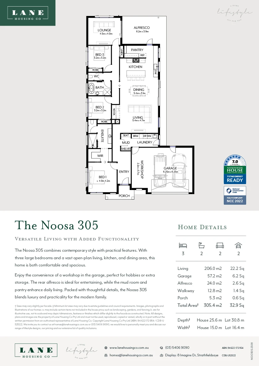 NOTE: Final NatHERS rating and NCC 2022 compliance requires certification of complete site-specific plans by an accredited energy rating specialist. Your home’s energy rating is influenced by the house plans, fit-out choices, and site location. This can include accounting for North orientation, placement of living areas, size and position of windows, site fall, engineering, and other site-specific overlays.