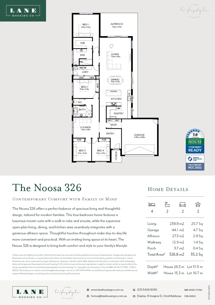 NOTE: Final NatHERS rating and NCC 2022 compliance requires certification of complete site-specific plans by an accredited energy rating specialist. Your home’s energy rating is influenced by the house plans, fit-out choices, and site location. This can include accounting for North orientation, placement of living areas, size and position of windows, site fall, engineering, and other site-specific overlays.
