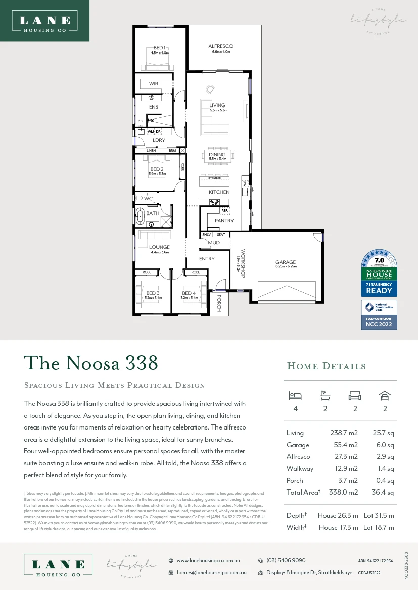 NOTE: Final NatHERS rating and NCC 2022 compliance requires certification of complete site-specific plans by an accredited energy rating specialist. Your home’s energy rating is influenced by the house plans, fit-out choices, and site location. This can include accounting for North orientation, placement of living areas, size and position of windows, site fall, engineering, and other site-specific overlays.