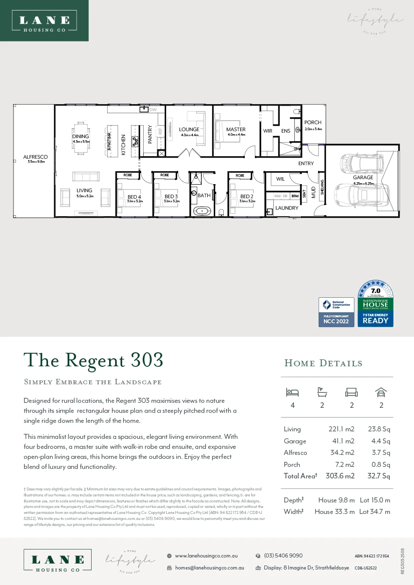 Designed for rural locations, the Regent 303 maximises views to nature through its simple rectangular house plan and a steeply pitched roof with a single ridge down the length of the home. This minimalist layout provides a spacious, elegant living environment. With four bedrooms, a master suite with walk-in robe and ensuite, and expansive open-plan living areas, this home brings the outdoors in. Enjoy the perfect blend of luxury and functionality.