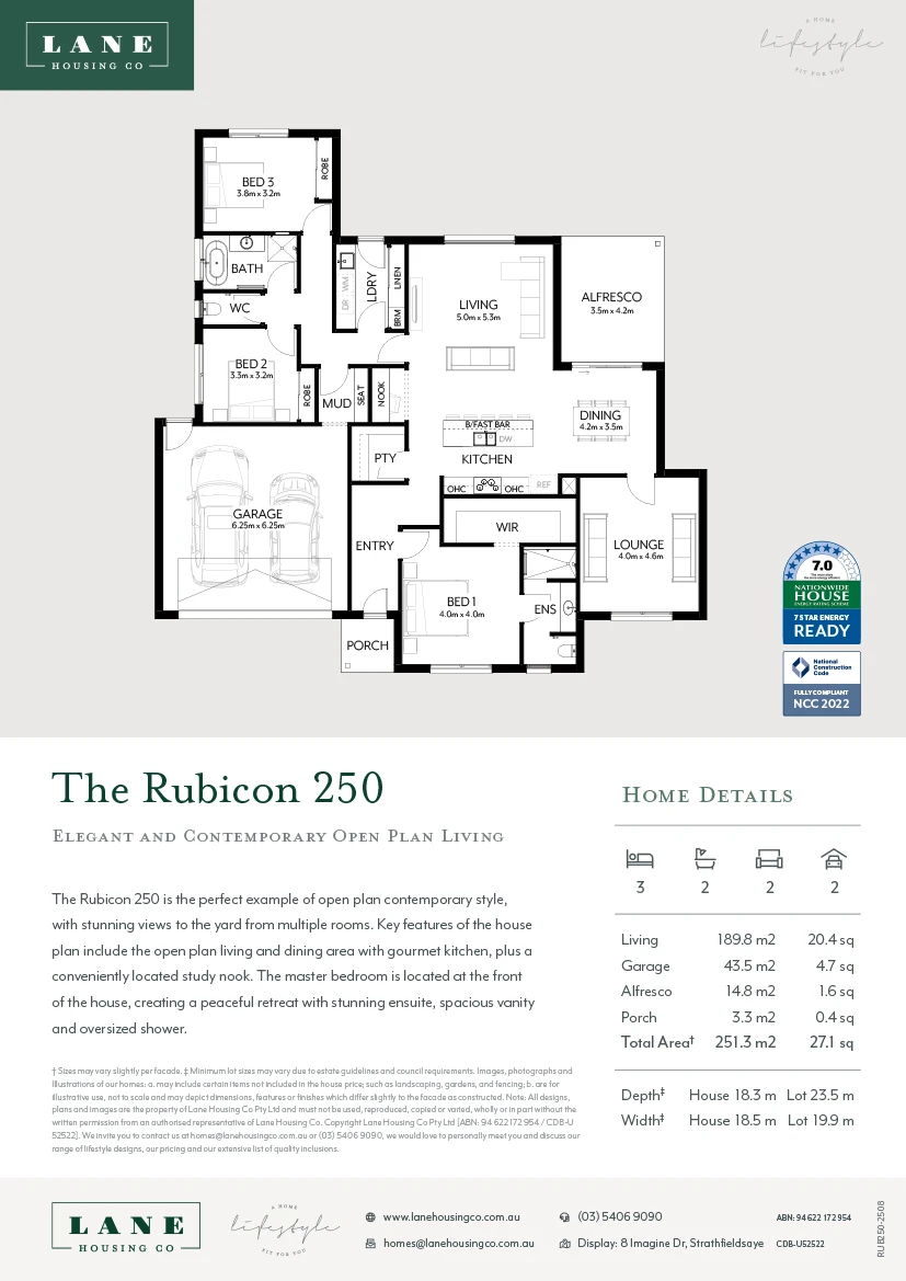 NOTE: Final NatHERS rating and NCC 2022 compliance requires certification of complete site-specific plans by an accredited energy rating specialist. Your home’s energy rating is influenced by the house plans, fit-out choices, and site location. This can include accounting for North orientation, placement of living areas, size and position of windows, site fall, engineering, and other site-specific overlays.