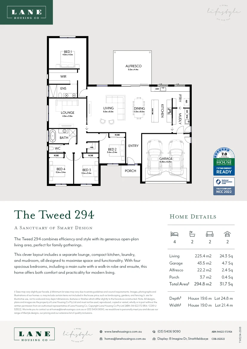The Tweed 294 combines efficiency and style with its generous open-plan living area, perfect for family gatherings. This clever layout includes a separate lounge, compact kitchen, laundry, and mudroom, all designed to maximise space and functionality. With four spacious bedrooms, including a main suite with a walk-in robe and ensuite, this home offers both comfort and practicality for modern living.