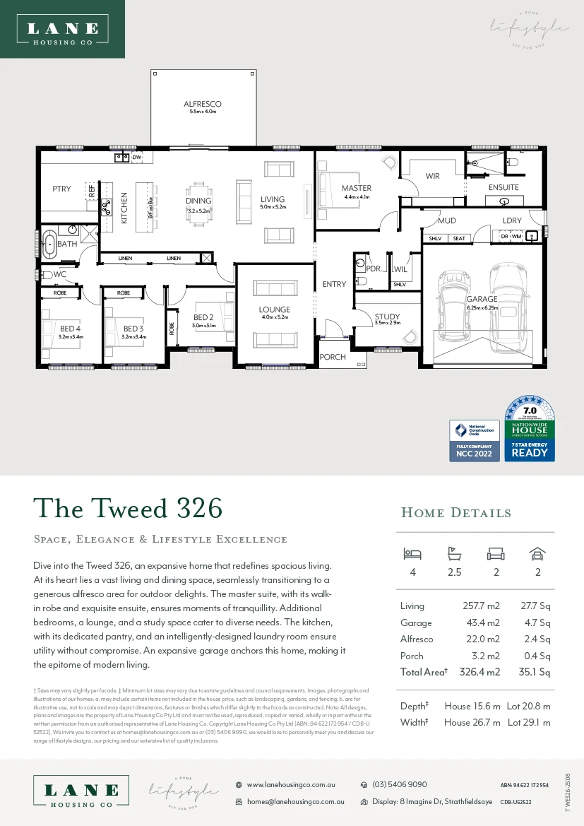 Dive into the Tweed 326*, an expansive home that redefines spacious living. At its heart lies a vast living and dining space, seamlessly transitioning to a generous alfresco area for outdoor delights. The master suite, with its walk-in robe and exquisite ensuite, ensures moments of tranquillity. Additional bedrooms, a lounge, and a study space cater to diverse needs. The kitchen, with its dedicated pantry, and an intelligently-designed laundry room ensure utility without compromise.